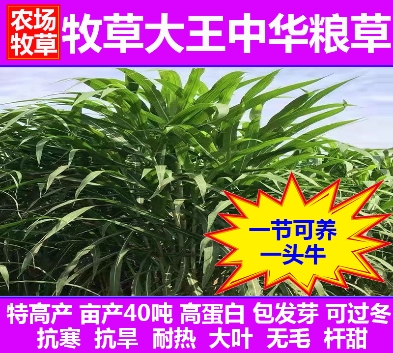 目前很多人种植中华粮草亩产在 年产牧草40吨 h 中华粮草自2012年被带到印度尼西亚进行跨纬度培育,尔后经过多年的多地区、多纬度种植、培育及验证,成为了高蛋白、高营养、高产量、高效益的新型牧草,将成为“绿色黄金产业”,被业内人士誉为“富国利民的产业工程”,是发展节粮型养殖业、解决以草代粮问题的最佳选择。 中华粮草八大特点: 速生性:种植后两个月,株高即可达到 1.5 米以上,就能进行第一次收割,再生力特强,夏季一个月左右又可长到1.5-2 米。 抗逆性强:在含盐量 0.6%、PH 值 8~9.5 的盐碱滩地能正常生长。它的抗盐碱特性对开发利用和改造我国盐碱地具有广阔的应用前景。 生命力强:耐寒抗旱,在全国大部分地区都可栽种。中华粮草耐酸、耐高温、耐干旱、可耐低温及微霜,无需农药除虫,成株后无需铲除杂草,管理简单。 产量高:北方春、夏、早秋三季,稳产量最少20 吨。南方一年四季种植收获,产量可达 40-60 吨。 营养丰富:经化验鉴定中华粮草蛋白含量高,总糖含量超过11%,可代替传统牧草成为各大农牧场的首选饲料。无需使用农药,产出的饲料无农残,肉蛋食品可申请绿色产品标识。